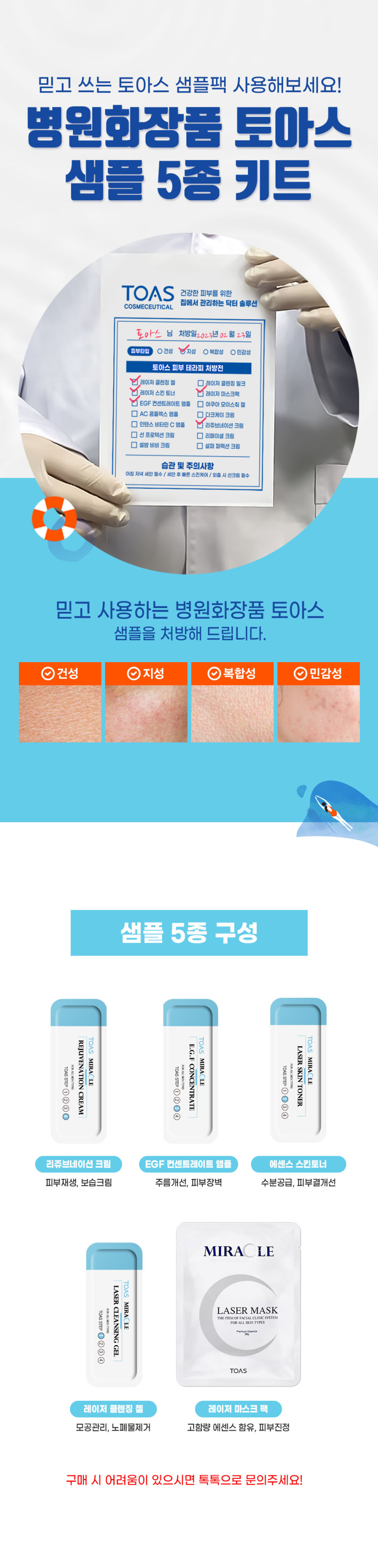 토아스 피부과화장품 5종 샘플 키트 체험팩 클렌저 크림 에센스 토너 마스크팩 1장